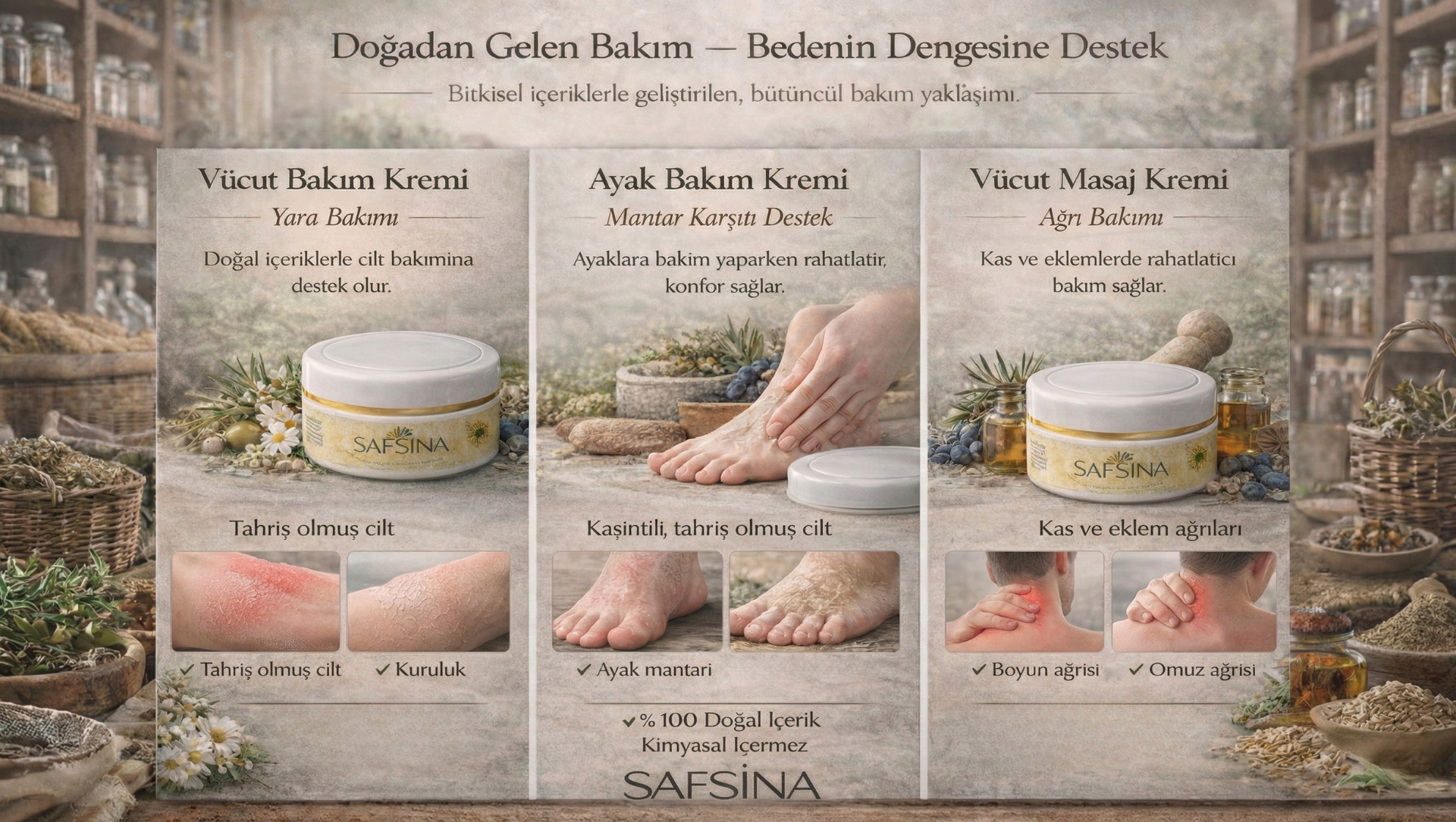Doğal ve etkili formülüyle öne çıkan vücut masaj kremimiz, bitkisel içeriklerin gücünü cildinizle buluşturur. Günlük yaşamın ve fiziksel yorgunluğun neden olduğu kas gerginliğini azaltmaya yardımcı olurken, cildi derinlemesine nemlendirir ve besler. Doğal yağlar ve bitki özleriyle geliştirilen bu etkili masaj kremi, masaj sırasında kolayca yayılır, hızlı emilir ve yağlı bir his bırakmaz. Düzenli kullanımda cildin daha yumuşak, esnek ve canlı bir görünüme kavuşmasına destek olan doğal vücut masaj kremi, spor sonrası rahatlama ve günlük bakım rutini için idealdir. Kimyasal ağırlıklı ürünlere alternatif arayanlar için güvenilir, doğal ve etkili bir çözümdür.
